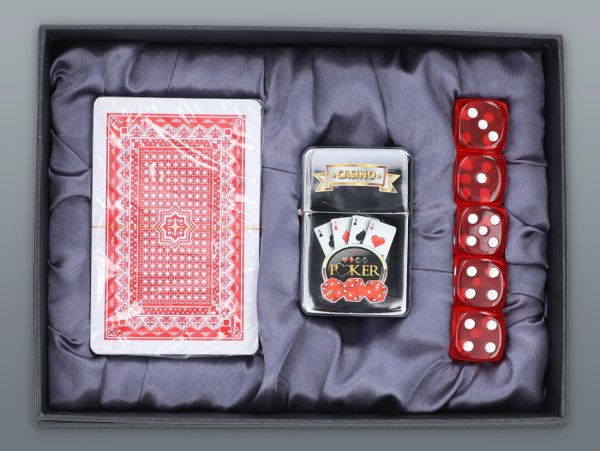 Tato luxusní dárková sada obsahuje vše, co potřebuješ pro dokonalý večer – kvalitní zapalovačku, 2 balíčky hracích karet a 5 herních kostek 🎲.