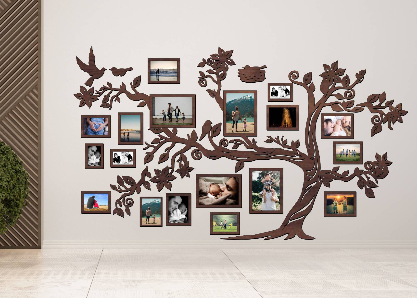 Dřevěný fotorámeček na zeď ve tvaru rodinného stromu s ptáčky a hnízdem je výrazná bytová dekorace, která promění prázdnou stěnu v osobní rodinnou galerii. Bohatě tvarované větve, jemné listy, ptáčci a symbolické hnízdo vytvářejí motiv domova, rodiny a soudržnosti.