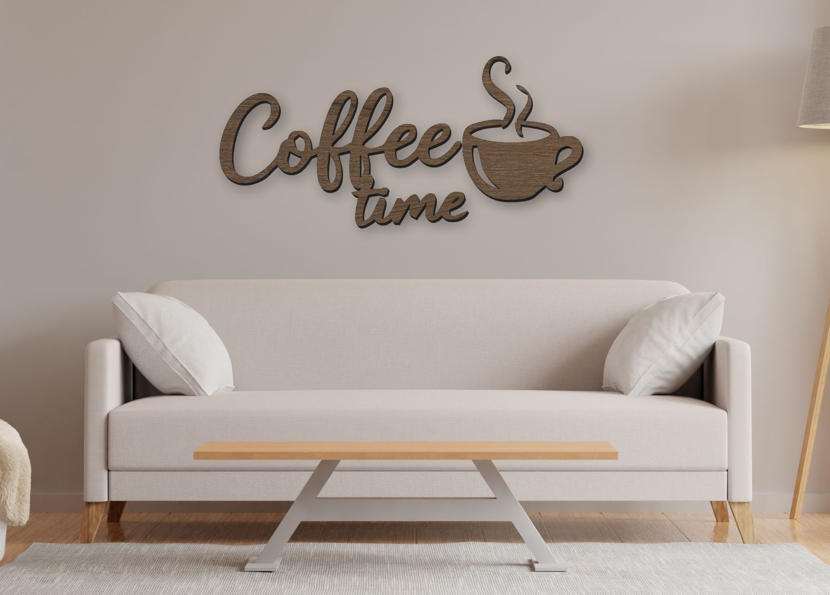 Drevený nápis Coffee time na stenu s motívom šálky. Moderná dekorácia z HDF dreva do kuchyne alebo jedálne. Ideálny doplnok pre milovníkov kávy.