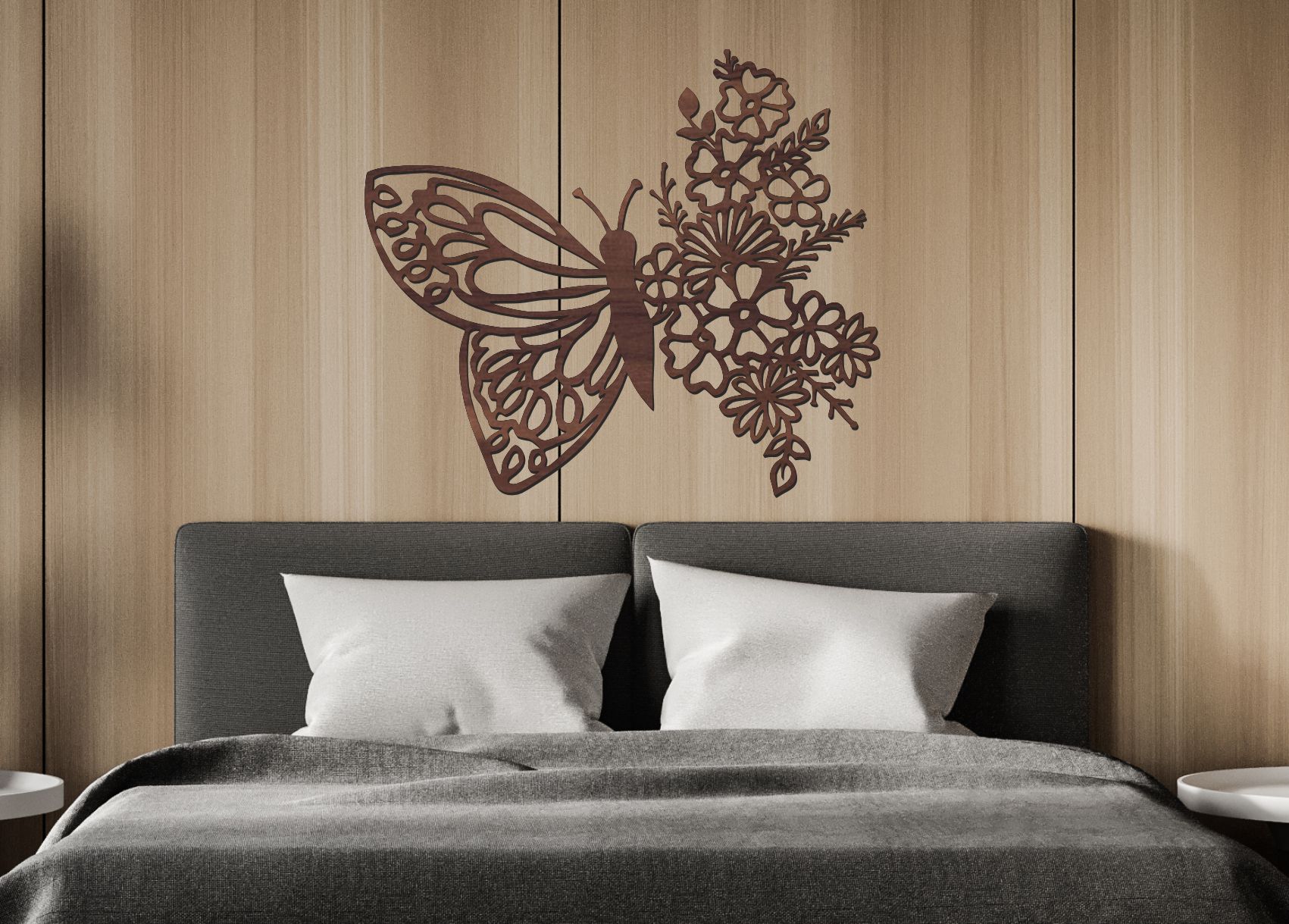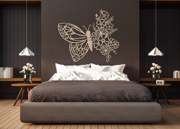 Dřevěný obraz – Motýl s květinami přinese do vašeho domova jemnost, eleganci a krásu přírody. Detailní motýlí křídla a bohatý květinový motiv působí moderně i romanticky.