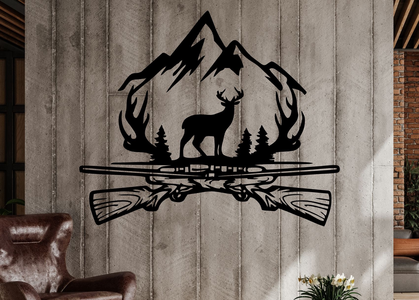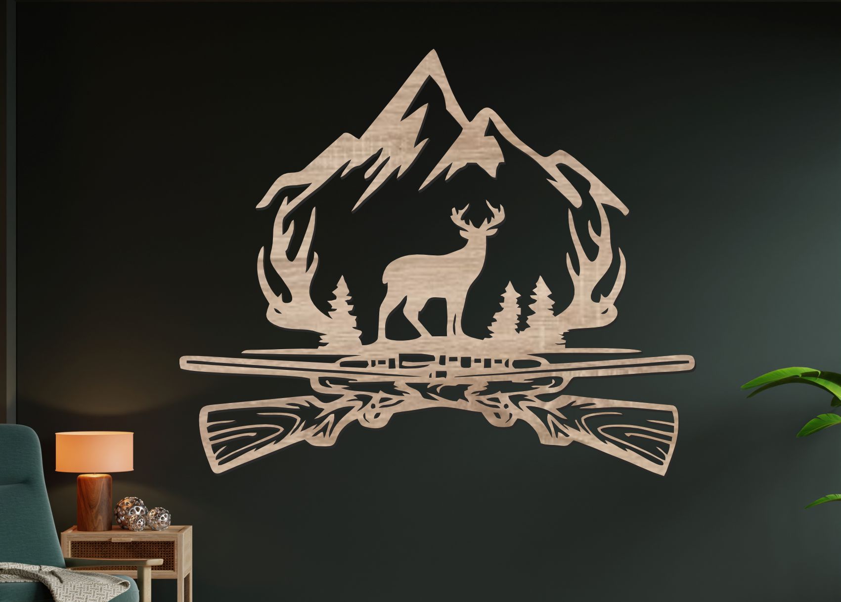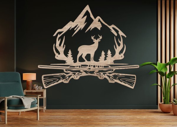 Dřevěná dekorace pro myslivce – jelen, hory a lovecké pušky