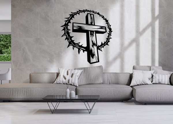 Tento působivý dřevěný obraz zachycuje kříž obklopený trnovou korunou – výrazný symbol utrpení, lásky a naděje. Hodí se do domácnosti, kaple, fary i kostela a je vhodný také jako duchovní dar.