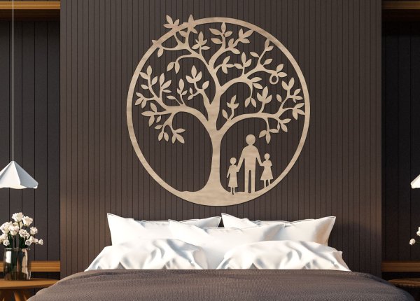 🌳 Dřevěný strom života – Rodinný kruh je symbolická nástěnná dekorace, která spojuje motiv stromu života s kruhem představujícím jednotu a rodinné pouto. Pod korunou stromu stojí siluety rodiče a dvou dětí, což vytváří krásný symbol rodiny, ochrany a společného života.