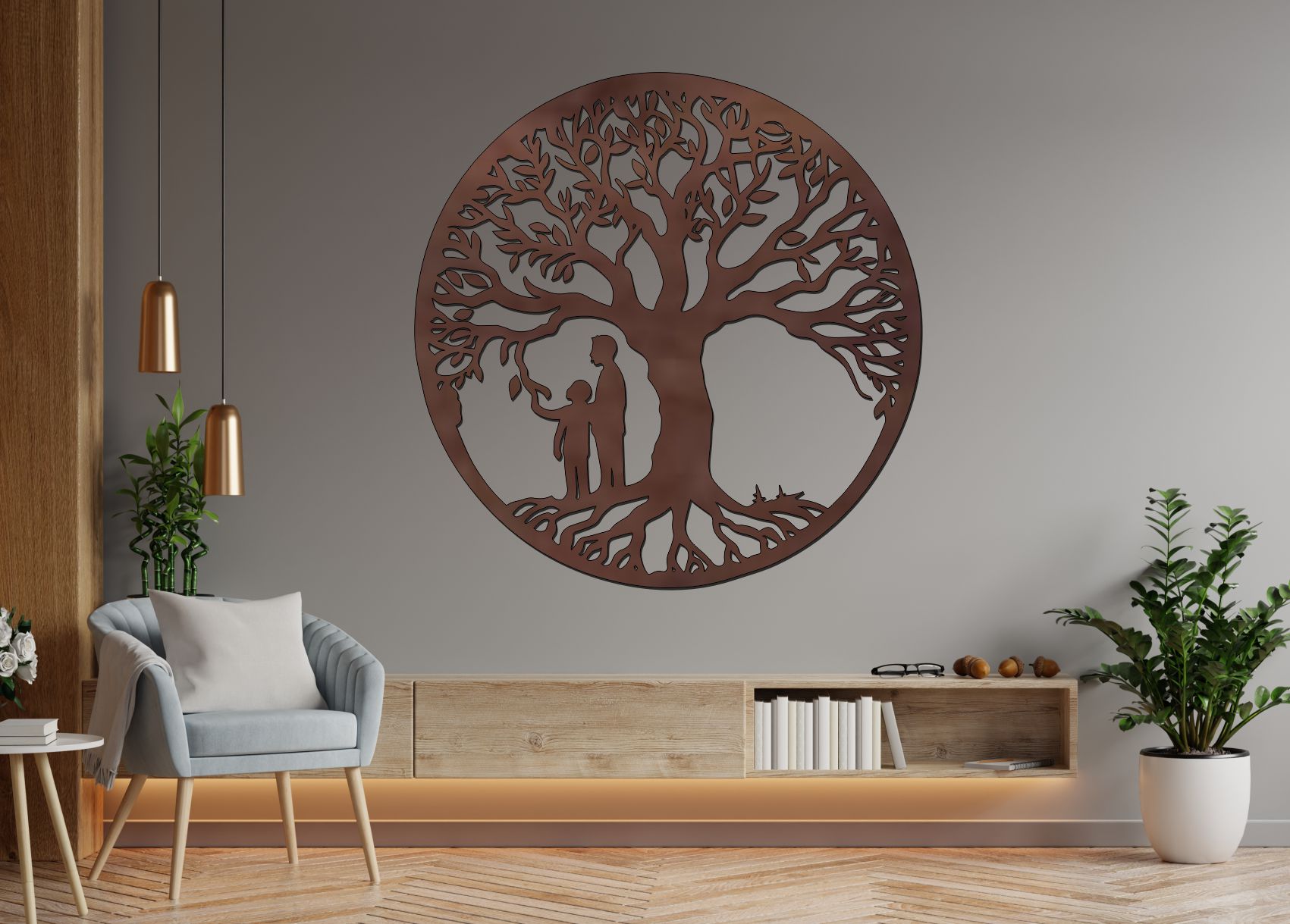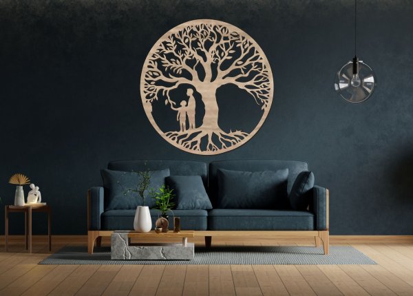 Tento dřevěný strom života na zeď vyjadřuje symboliku rodiny, blízkosti a pevných kořenů. Jemný siluetový detail pod korunou stromu působí citlivě a univerzálně, díky čemuž je dekorace vhodná do každého interiéru.