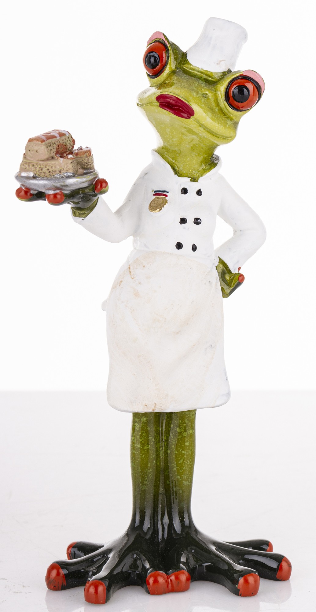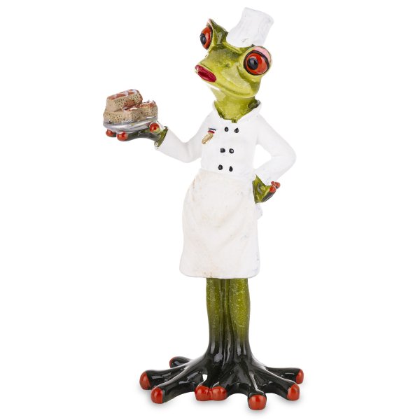 Tato keramická žabka – elegantní kuchařka vnese do vašeho domova špetku gurmánského kouzla. Vysoká a štíhlá žabka stojí s hrdým výrazem, oblečená v bílém kuchařském kabátku a zástěře. Na hlavě má vysokou kuchařskou čepici, která jí dodává profesionální vzhled.