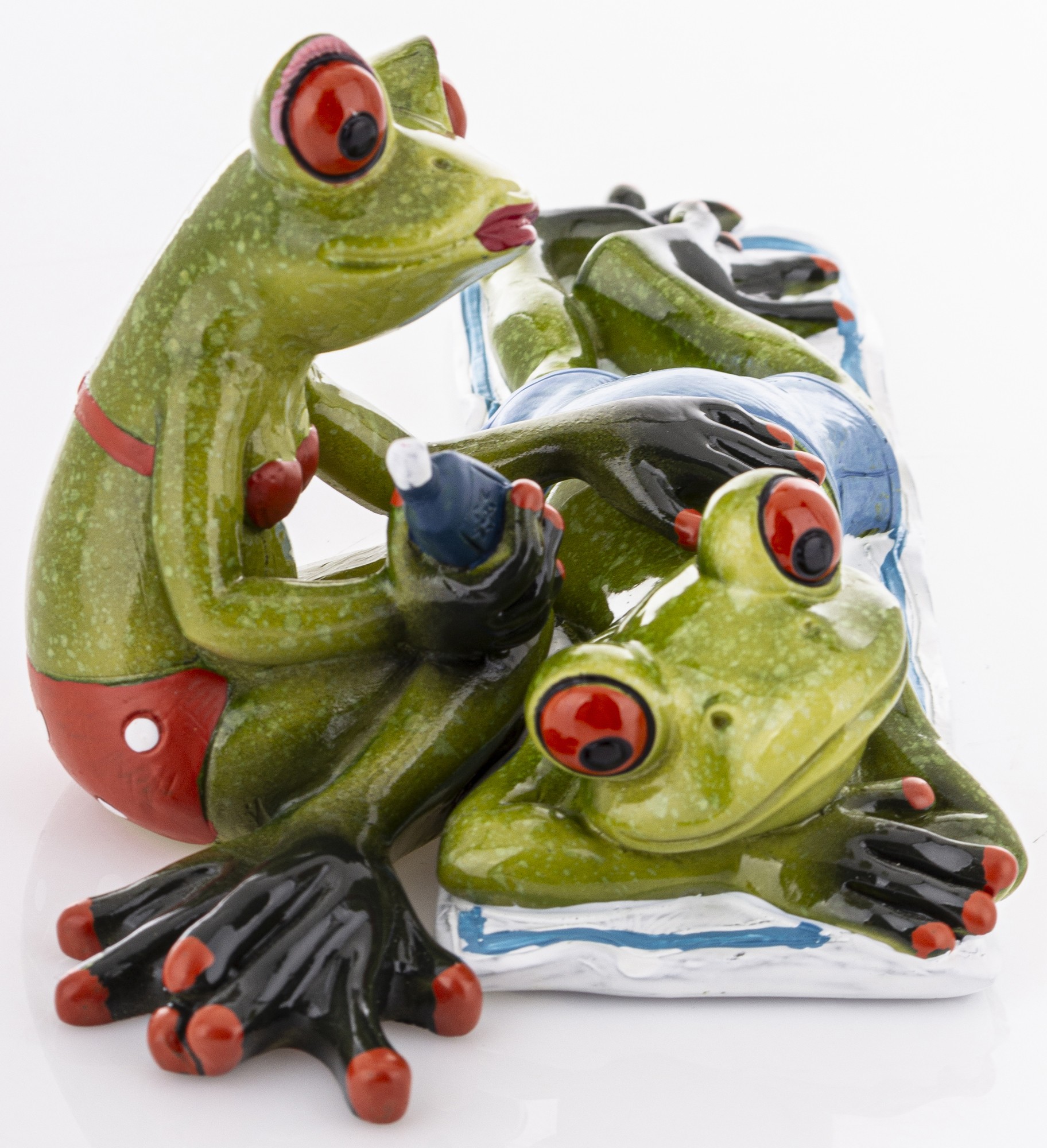 Dopřejte si trochu pohody s těmito keramickými žabkami při relaxační masáži 🐸💆♀️. Vtipná dekorace zachycuje scénu, kdy jedna žabka pečlivě masíruje partnera, který si užívá zasloužený odpočinek na ručníku.