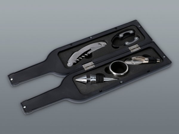 Praktické balení náčiní pro vinaře v pěkném provedení ve tvaru vínové láhve.