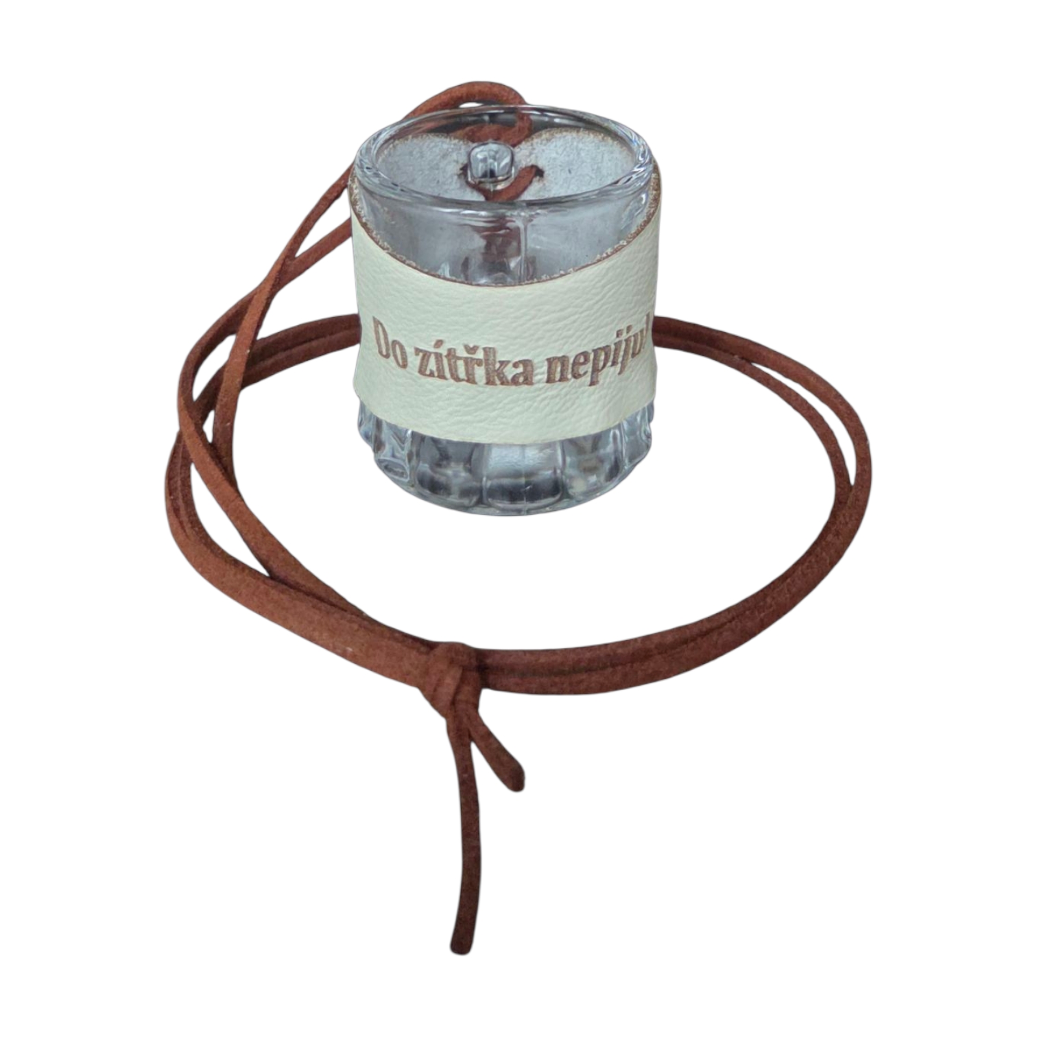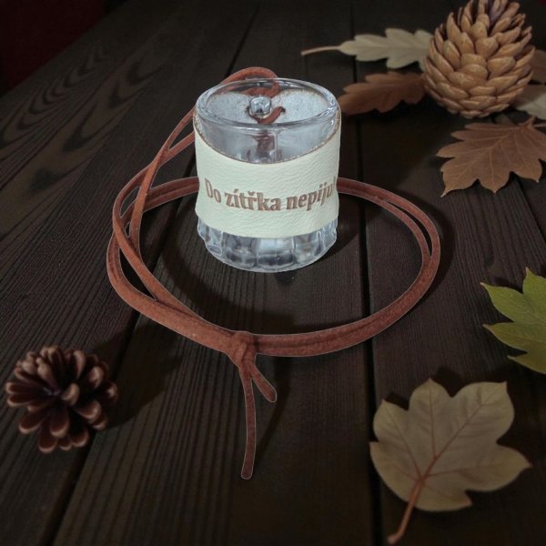 Skleněný panák s koženým obalem – Do zítřka nepiju! 🥃