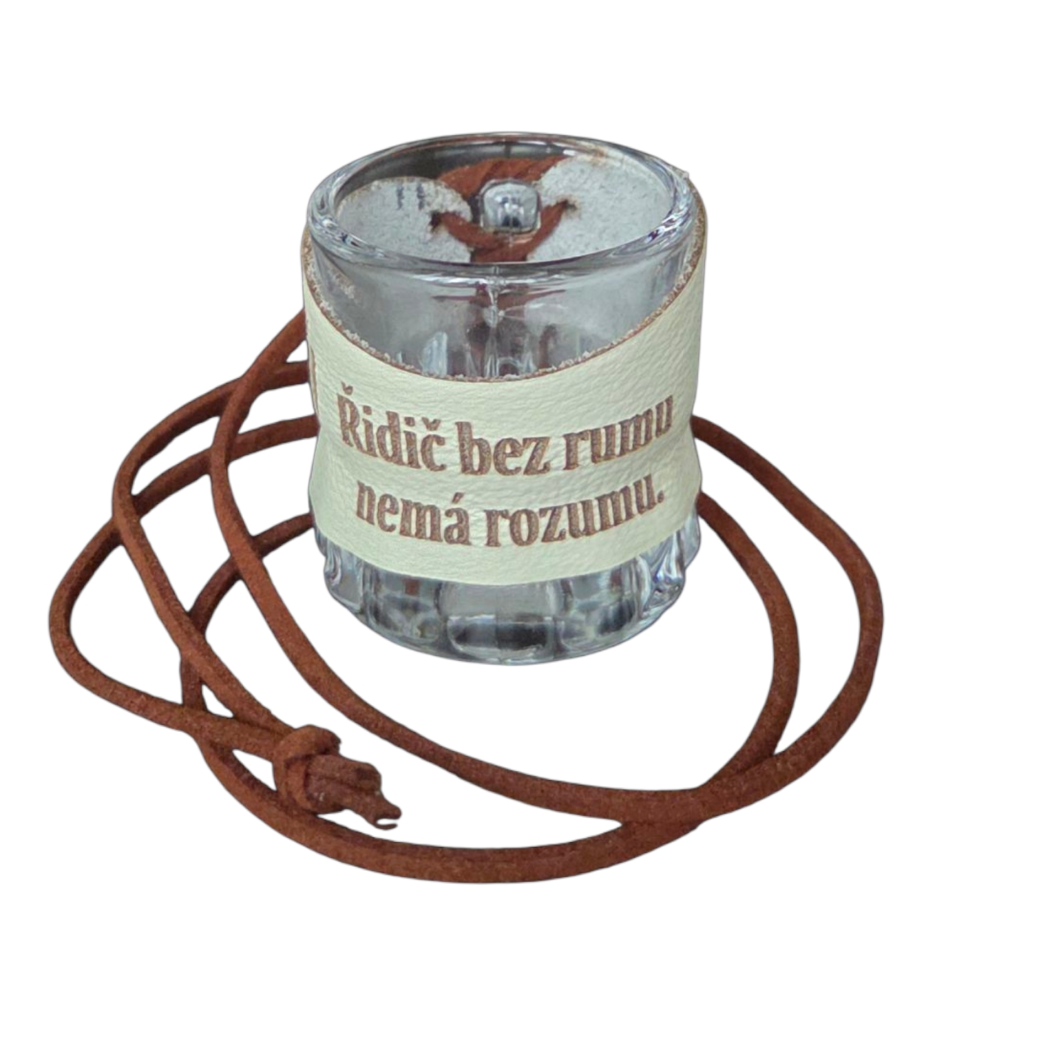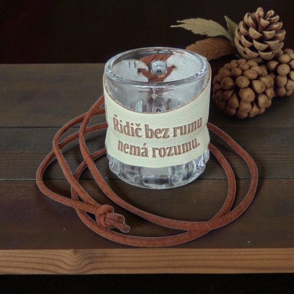 Skleněný panák s koženým obalem – Řidič bez rumu nemá rozumu 🥃