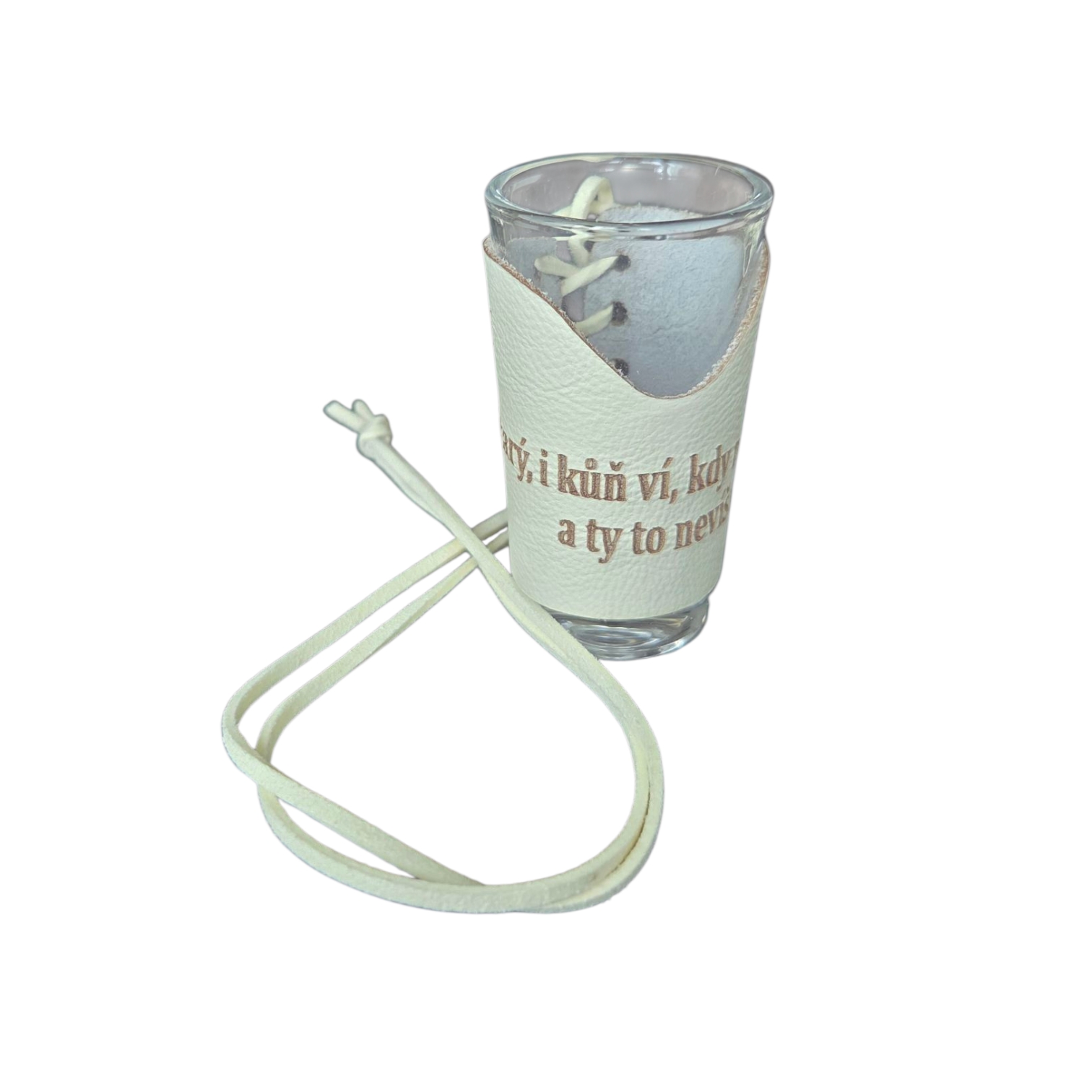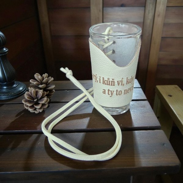 Panák o objemu 25 ml je vyroben z kvalitního čirého skla, oblečen do pravého koženého obalu a doplněn praktickou šňůrkou na krk, takže ho máš vždy po ruce pro okamžitý přípitek 🍻. Ruční výroba zaručuje, že každý kus je originál a má stylový, tradiční vzhled.
