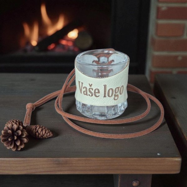 Skleněný panák s koženým obalem – Vaše logo 🥃