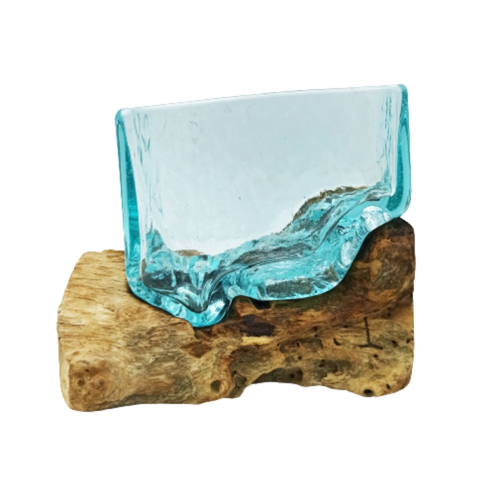 Tavené sklo na dřevě - 2 x Velká čtvercová mísa jsou novým hitem, který k nám přichází z Bali. Ručně vyráběné foukáním z recyklovaného skla a kořenů dřeva Gamal. Ještě horké sklo se položí na výřez kořene a nechá se vytvrdit do tvaru dřeva, čímž se zajistí dokonalé přilnutí. Každý z těchto výrobků je jedinečný.