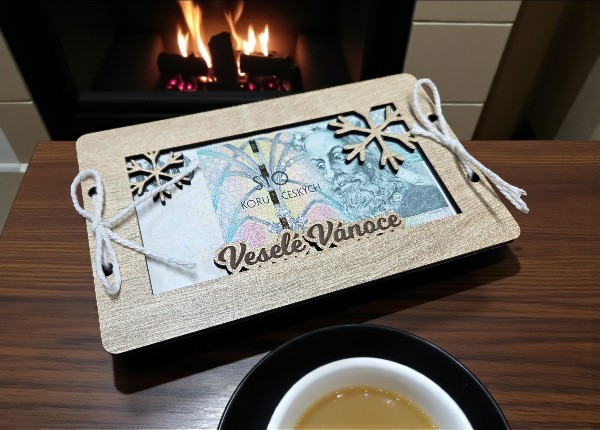 🎄 Chcete originální a krásný způsob, jak darovat peníze k Vánocům? Tato vánoční dřevěná obálka na peníze působí luxusně, hřejivě a je mnohem elegantnější než klasická papírová obálka.Vyrobena je z kvalitního HDF dřeva, zdobená vločkami a nápisem Veselé Vánoce. Bankovka se zasune do předního výřezu a po stranách se upevní pevnou bílou šňůrkou, díky čemuž drží bezpečně na místě. Design má krásnou zimní atmosféru a dárek působí opravdu výjimečně.