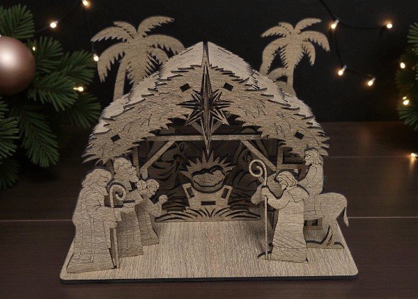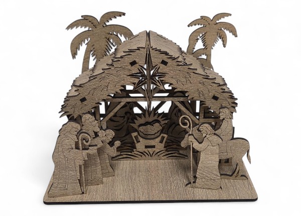 Použití kvalitního dřeva dodává dekoraci stabilitu, krásnou strukturu a přírodní charakter. Vyřezané postavy svaté rodiny jsou jemně tvarované, s pečlivým ohledem na detaily, aby působily harmonicky a přirozeně. Stříška dotvára celou scénu a dodává jí pocit bezpečí a útulnosti.